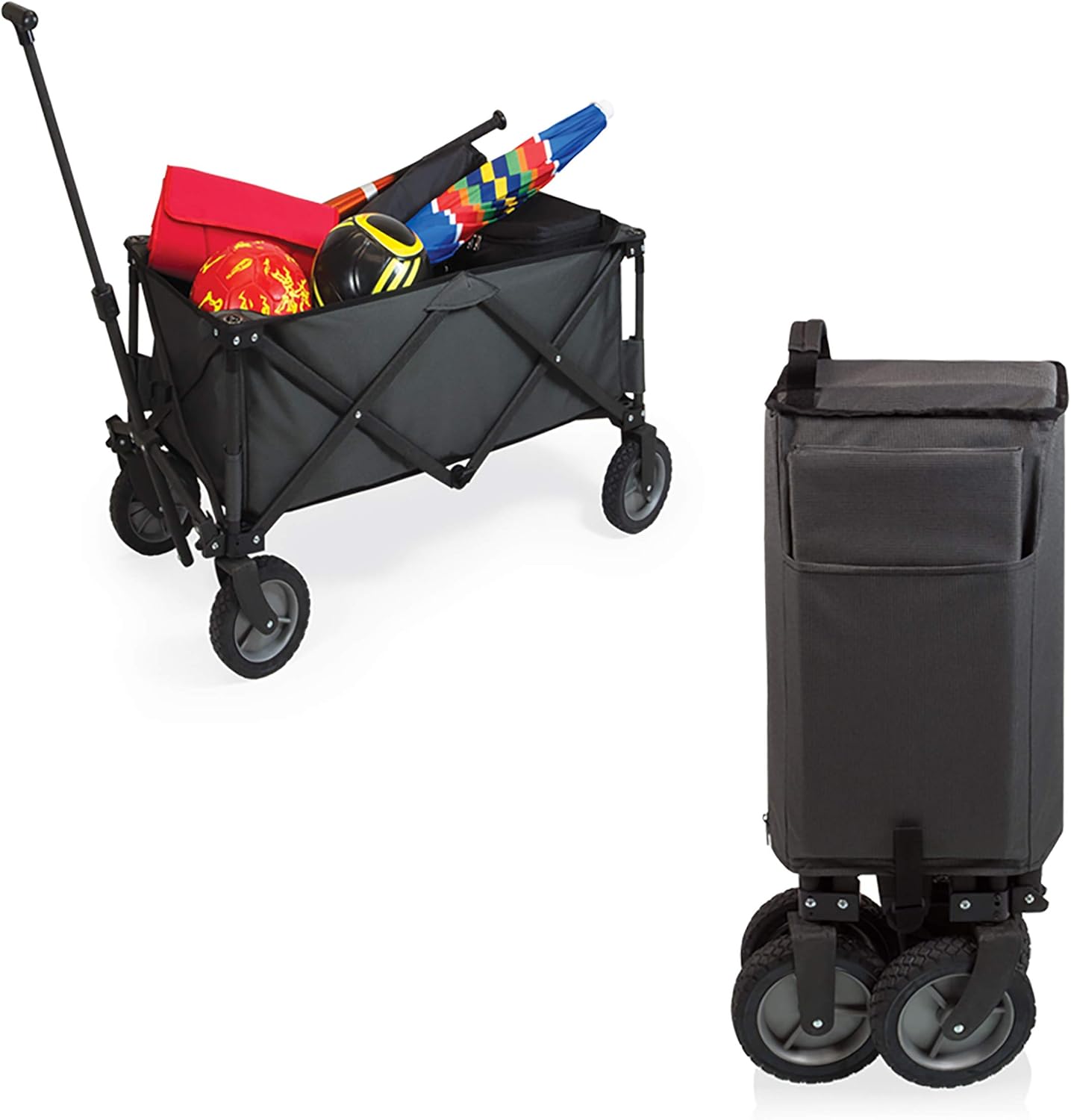 This Adventure Wagon by Oniva, a Picnic Time brand, features a portable, collapsible design with four heavy-duty wheels and telescoping handle, perfect for loading with your family's gear, food and accessories for easy transport. Fun for adults and kids alike, this utility wagon has zippered hanging pockets inside and can be used for picnics, bringing groceries in from the car, play dates or moving things around in the yard. The Adventure Wagon is on a durable, powder-coated steel frame with two-tone 600D polyester and folds into a compact size and includes a fitted cover with carry handle for easy storage and transport. Maximum weight capacity 110 pounds. Measures when open approximately 35-1/2 by 19 by 22 inches..