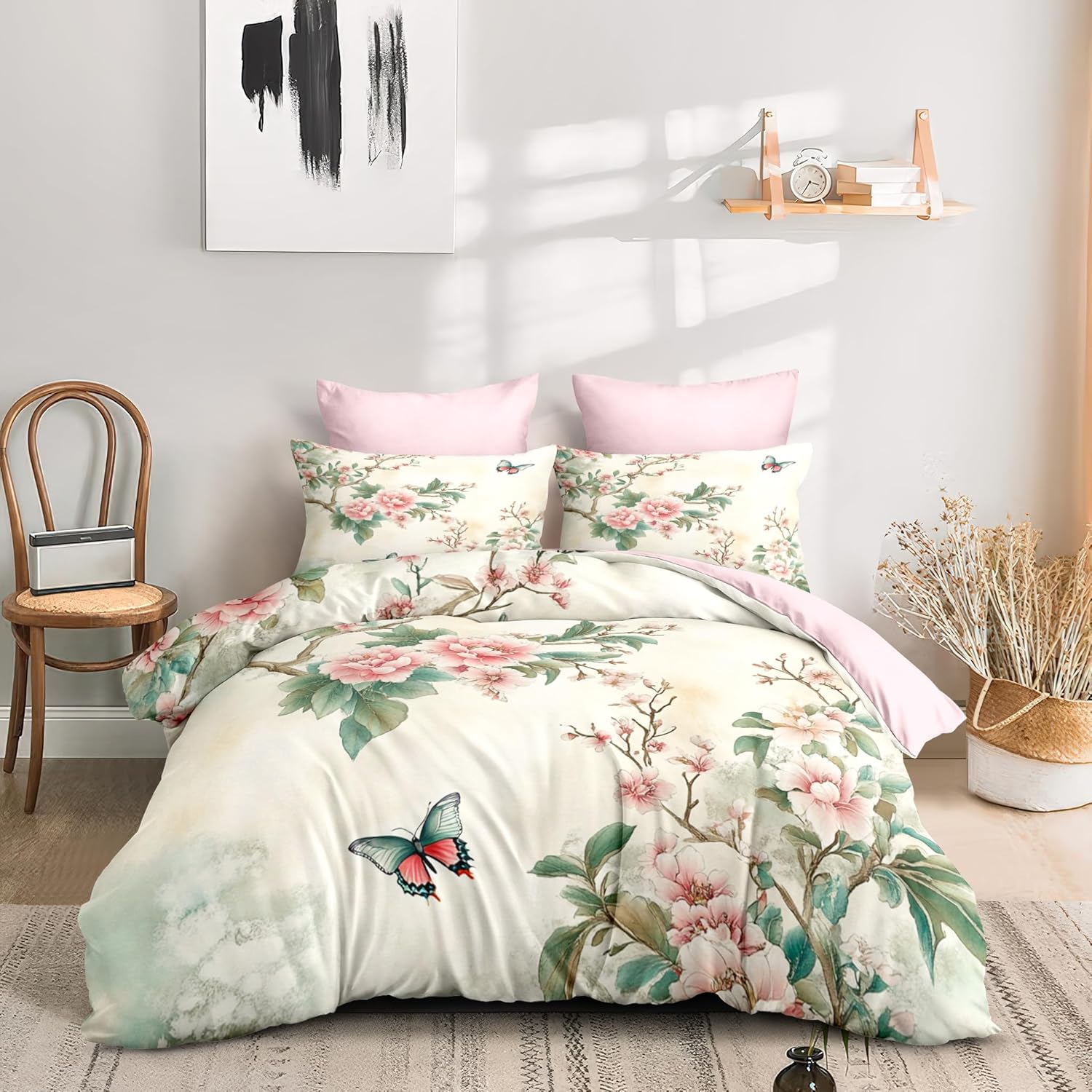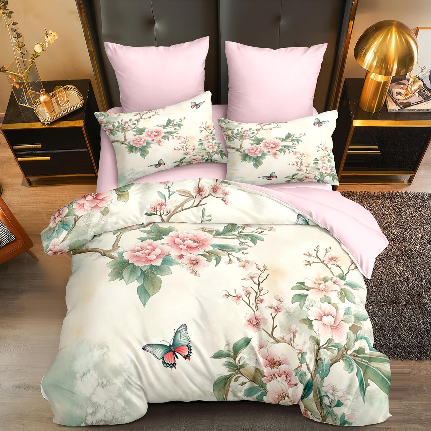 Material: This pink floral comforter set queen size is made of ultra-fine fiber Continuous softening after each wash. This green flower butterfly bedding set is very lightweight, without shrinking, anti pilling, anti wrinkle, durable and long-lasting. This pink floral comforter does not use chemical to harm your and your family's health. Size Information: 1 Queen size pink floral comforter set 90"X 90" (228cm*228cm) & 2 pillow cases 20"X 30" (50cm*75cm). Pillow and sheet are NOT included. Unique Design: Our green flower butterfly comforter pattern is printed using 3D technology, with clear pattern and anti fading. The U-shape stitching ensures the microfiber filler is sewn tightly to prevent clumping or shifting. Due to our use of vacuum packaging, please gently pat this pink floral bedding sets after receiving the goods to make them fluffy again. The unique design of this comforter perfectly matches other interior decoration. Usage: The best choice for Valentine's Day, Birthday, wedding anniversary, Christmas and other holiday. The green flower butterfly bedding set for bedroom, dorm room, hotel, guest room, outing, RVs, camping and other place. Present for family, parents, children, friends, boys, girls, adult, women, men. Tips: The pink floral comforter set & pillow shams are printed on the front side, the back is white. Due to monitor differences, there are some color differences between the image and the actual product. Due to manual measurement issues, please allow an error of 2-3 centimeters. Machine wash in cold water and tumble dry at low temperature. Service: We are committed to providing comfortable bedding, so that we provide you with 365 days of high-quality sleep. Welcome to our store to purchase more products. If you have any questions, please contact us and we will process your request as soon as possible within 24 hours.