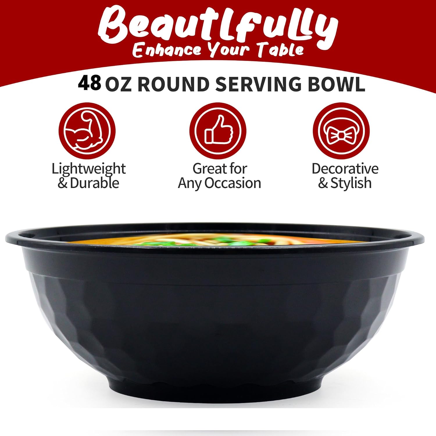 Product Description: Freezer and Microwave Safe Plastic bowls disposable can be both frozen and microwaved.Whether you are in a rush at home, or warming up food in the microwave at the office or in your college dorm room,make your life simple warming up your food in the container. Super Space Saver: Our stackable plastic bowl helps you save storage space. Great for birthday parties,baby showers, and weddings. Note: PP5 material can be used to pack food, but it is only suitable for low-temperature filled food or beverages, and the temperature of the packaged food is required to be lower than 100C. Specification: Package includes:150x food prep bowls Material:PP5 size:6.8x3.7inch-36oz,7.3*3.7inch-42oz Color:black
