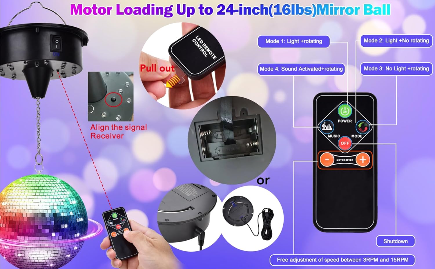 | Included Components | motor+remote control+16.4ft USB power supply line+Instruction manual+6''Disco Ball |