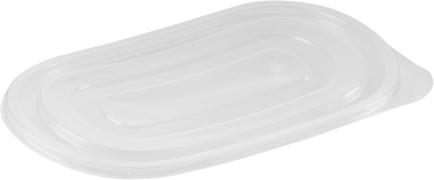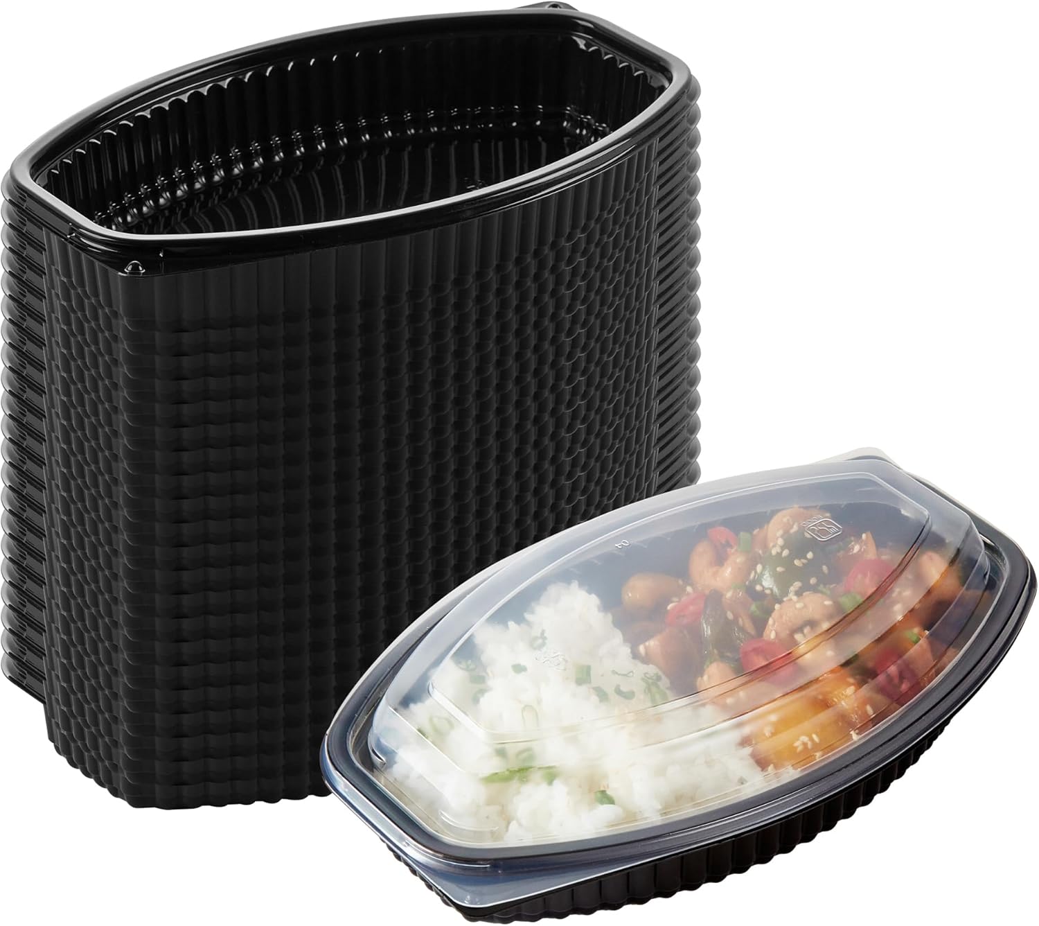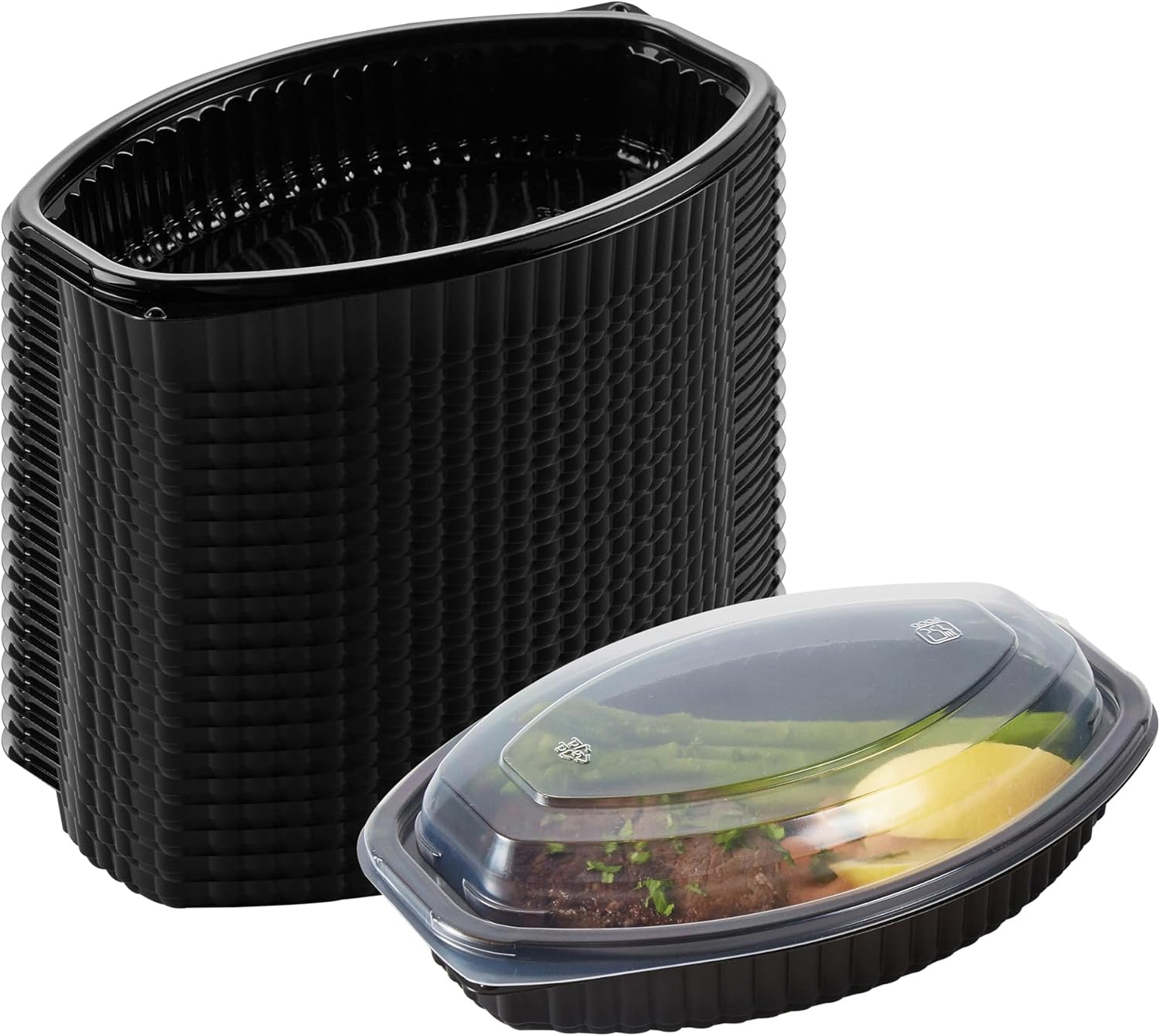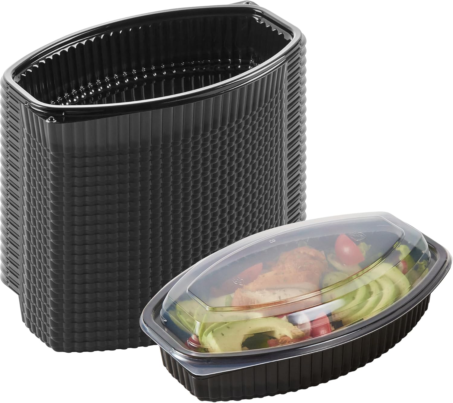Discover convenience with our Chef 101 25-ounce Oval Black Plastic Food Containers. These take out containers come equipped with a clear plastic lid and form a secure seal, keeping your food intact in transit. The flat design of these plastic lids allows you to easily stack and store the containers, maximizing space efficiency and ensuring secure transport. These to go containers are microwavable and provide customers the convenience of reheating meals without changing utensils. Created from premium plastic, these carry out containers are suitable for holding hot and cold food items. For easy food display, these clear lids provide excellent sibility and showcase the contents inside. The sleek black finish of these takeaway containers adds a touch of sophistication to your meals. To store your leftovers, these food containers with lids are freezable. These plastic food containers can be discarded after use and ensure a straightforward cleaning experience. With a capacity of 25 ounces, these plastic containers with lids measure 9.3 inches in length by 5.9 inches in width by 1.7 inches in height. Sold in a 50 count box.