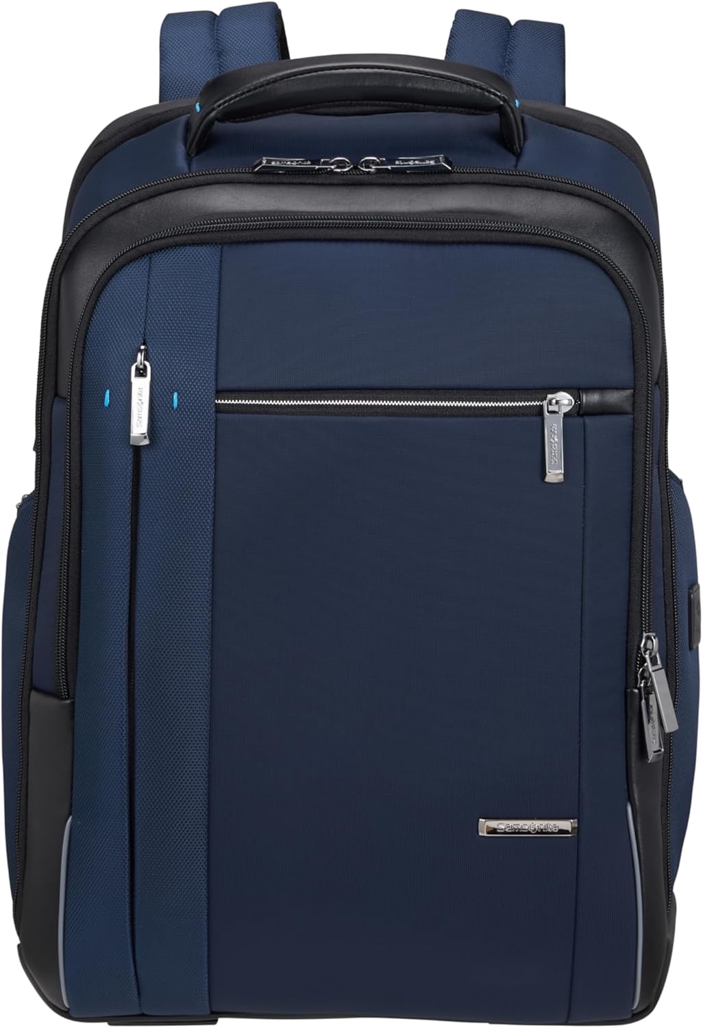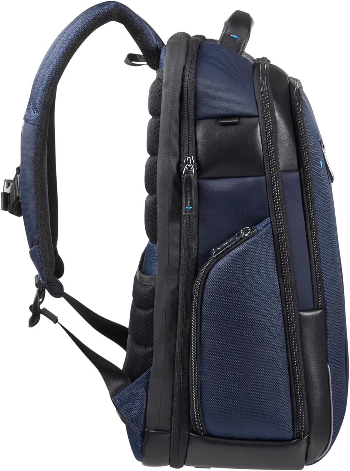 3 inches, expandable (26.5L to 30.5L), USB charging port. Recycled materials: 55% polyester, 40% nylon, 5% PU. Adaptable laptop compartment, internal organization, side water bottle pocket. Classic, elegant design from Samsonite's business collection, featuring enhanced organization and easy access.