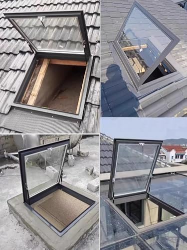 Transform your home with our premium roof skylights, expertly crafted to enhance ventilation and infuse natural light into your living spaces. Perfect for attics, sunrooms, and basements, these skylights not only elevate the aesthetic appeal of your home but also improve its functionality. Constructed with durable aluminum alloy frames and double-layer tempered glass, they promise longevity and energy efficiency, making them a smart addition to any residence. Experience the freedom of a bright and airy atmosphere, thanks to an impressive opening angle of up to 80 degrees that allows for easy regulation of airflow. You can trust in the seamless corner welding, which minimizes the risk of leakage and provides peace of mind with each installation. These versatile skylights are designed for multiple applications, serving as attic skylight covers, practical escape hatches, or cellar covers. The hydraulic power lock system ensures effortless opening from the inside, making them user-friendly and safe. With customizable dimensions, you can find the ideal fit tailored to your specific needs. Please note that these skylights are operated from the interior, enhancing safety and convenience. Elevate both the look and functionality of your home while enjoying the refreshing benefits of natural light and airflow. Package includes: 1 x Roof Skylight (other items shown in pictures are not included). Slight variations may occur due to display settings, and manual processing may result in size discrepancies of 1-2 cm.