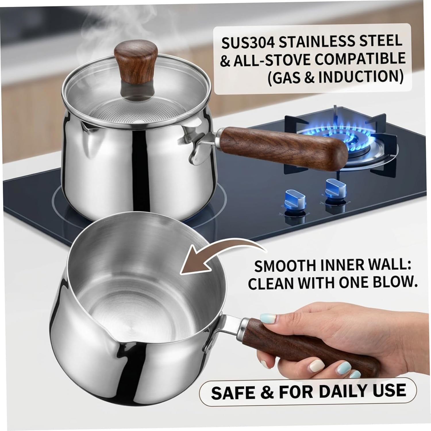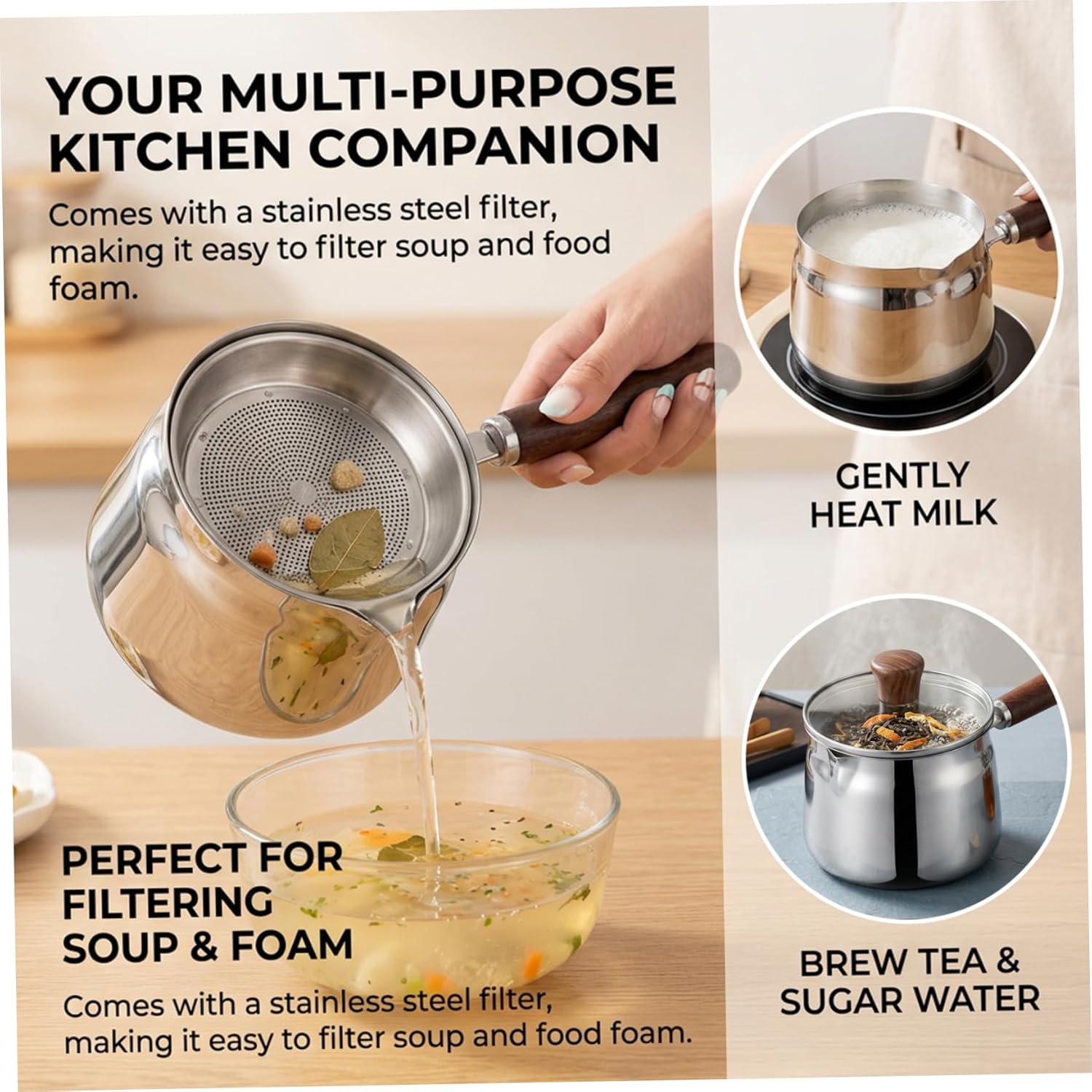 Description: Discover the convenience of a perfectly sized saucepan designed for daily cooking tasks. Our 1.2-liter Stainless Steel Saucepan combines functionality with thoughtful details to support your kitchen routine.Crafted with food-grade 304 stainless steel, the pot body ensures a sturdy and safe cooking environment. It heats evenly and resists sticking, making it suitable for warming milk, simmering sauces, cooking oatmeal, or preparing single-serving dishes like noodles or soup. The matching high-borosilicate glass lid locks in heat and humidity while allowing you to keep an eye on your food.We've included a practical bonus: a fine stainless steel filter mesh. This handy accessory rests inside the pan, perfect for draining pasta or removing excess foam when making homemade baby food, providing you more utility from a single pot.User comfort was a priority. The extended walnut wood handle remains cool during stovetop use and provides a secure, comfortable hold. The added pour spout provides control when draining liquids or serving, helping to keep your stovetop tidy. Cleaning is straightforward thanks to the smooth, polished interior-often requiring just a simple rinse.Ideal for small households, first kitchens, or as a dedicated pot for infant meals, this versatile saucepan is compatible with all major stovetop types, including induction. It's a reliable, multi-purpose addition to your cookware collection. Features:. -Color: Silver. -Material: 304 stainless steel, high borosilicate glass, wood. -Size: Bottom diameter: approximately 14 cm/5.51 inch. -Capacity: 1200ml. Note:Manual measurement, please allow slight errors on size.The colors may exist slight difference due to different screens. P
