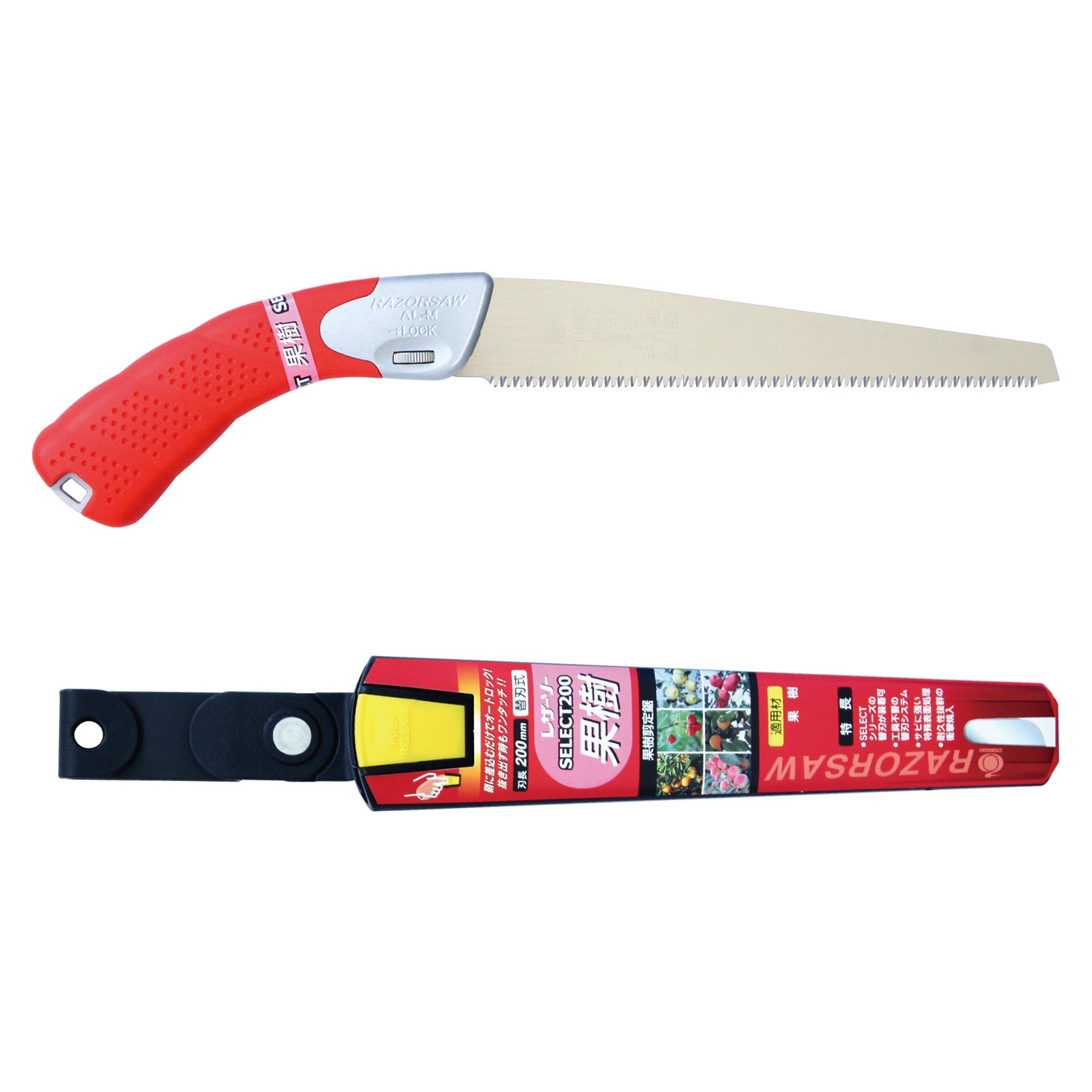 SELECT200 Fruit Tree (AL-M) Place of Manufacture: Miki City, Hyogo Prefecture, one of the leading hardware town in Japan. Sharpness: Vertical cutting can be cut vertically, horizontal, and slotted. Recommended Use: Ideal for raw trees, pruning, and trees. Recommended thickness: Can be cut comfortably with a diameter of up to 2.4 inches (6 cm). Compatibility: Fits all SELECT Series 7.9 inch (200 mm) replacement blades. Product Feature 1: Includes a sheath with an auto-lock function for easy portability. Product Feature 2: Elastomer resin for a non-slip grip. Product Feature 3:1 impact hardening per blade for greater durability