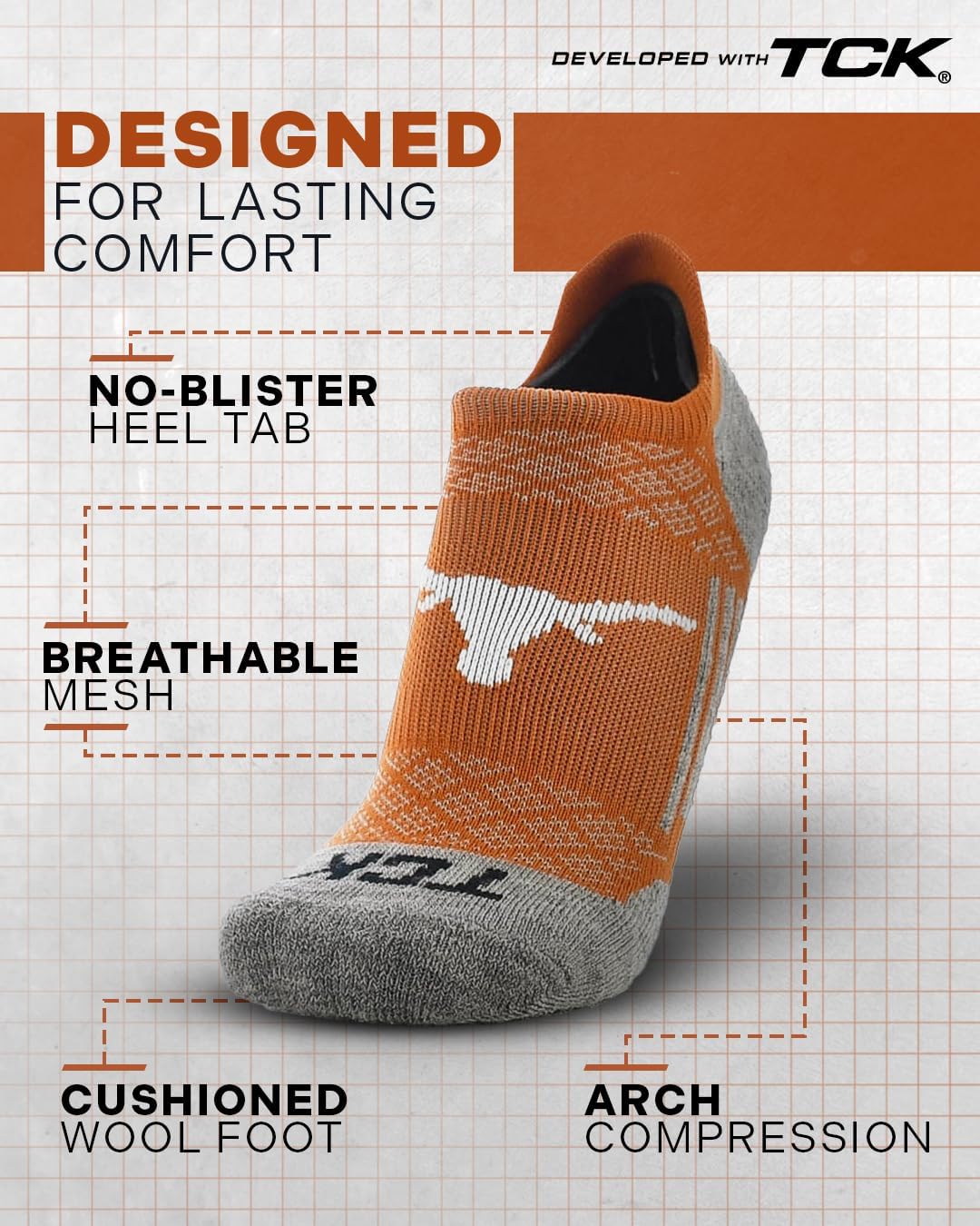 Show off your Texas Longhorns pride with our retro-inspired, stylish vintage college socks—perfect for men and women who want to combine style with team spirit. Featuring a low-profile design with a heel tab, these no-show socks deliver a sleek silhouette while protecting your heel and Achilles, making them the ultimate choice for athletes, sneakerheads, and fans alike—whether for running, game day, or everyday wear.