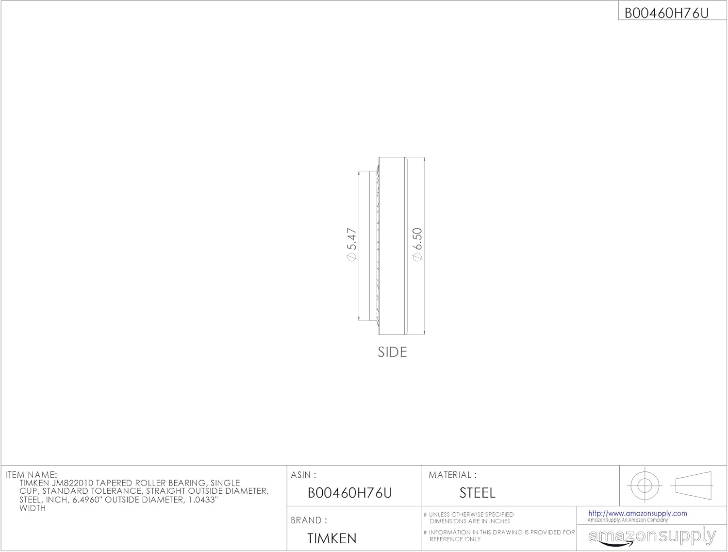 This Timken M822000 Series single cup matches with a single cone (inner ring assembly, sold separately) to assemble into a complete single tapered roller bearing, suitable for applications that support both radial and axial loads. This cup is matched to its cone assembly based on the load that the bearing needs to support, and if the bearing needs radial internal clearance to accommodate thermal expansion. Generally mounted in opposing pairs on a shaft to evenly distribute loads, this single tapered roller bearing assembly is stable in temperatures ranging from -54 to 120 degrees C (-65 to 250 degrees F). The single cup is made of Timken's high-alloy steel for durability, heat tolerance, and resistance to deformity under heavy loads. As part of a separable tapered roller bearing unit, this single cup has an open design that allows for lubrication and accurate adjustments. This single tapered roller bearing is for use in high-load, moderate-speed applications that include automotive axle systems and conveyor systems in heavy duty industries such as mining, construction and agriculture, among others.SpecificationsTapered roller bearings--Boundary dimensions and series designationsISO 355Inch part numbering systemABMA standard 19.2Width tolerance standardsISO 492Tapered roller bearing naming conventionsISO 720Rolling bearings use rolling elements to maintain the separation between moving parts to reduce rotational friction and support radial and axial loads. These elements can be one of the following types: ball, cylindrical, spherical, barrel, needle, spindle, or tapered. All rolling bearings are open, shielded, or sealed. Sealed bearings are lubricated with oil or grease in the bearing factory, while open and shielded bearings are meant to be lubricated in place, with periodic reapplication of lubrication, based on use. The shield protects the working parts of the bearing from environmental debris that may be introduced and could reduce the ball bearing speed and lifespan. Rolling bearings are used in a range of applications from agricultural machinery to conveying equipment, robotics, dental equipment, elevators, rolling mills, ship rudder shafts, and aggregate crushers, among others.The Timken Company manufactures a variety of bearings, alloy steels, and related components and assemblies that meet International Organization for Standardization (ISO) standards for quality assurance. Founded in 1899, the Timken Company is based in Canton, Ohio.
