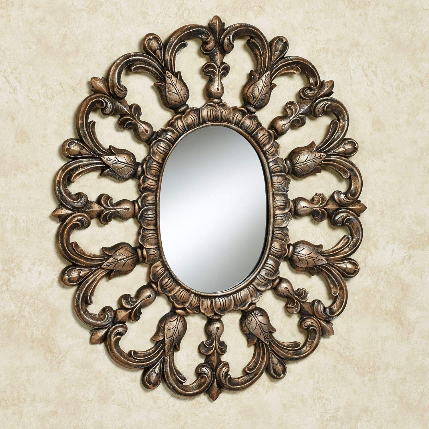 An elaborate finish and spectacular openwork frame make the Azura Oval Wall Mirror a perfect fit for lavish tastes. Finished in gold with a black wash and silver accenting, ornate polystone swirls, acanthus leaves, and flourishing designs surround the center oval glass mirror. Measures 18 Wx1 Dx21 H. Elaborate finish Gold, black, and silver tones Frame has an openwork design Center oval mirror Perfect for entryways.