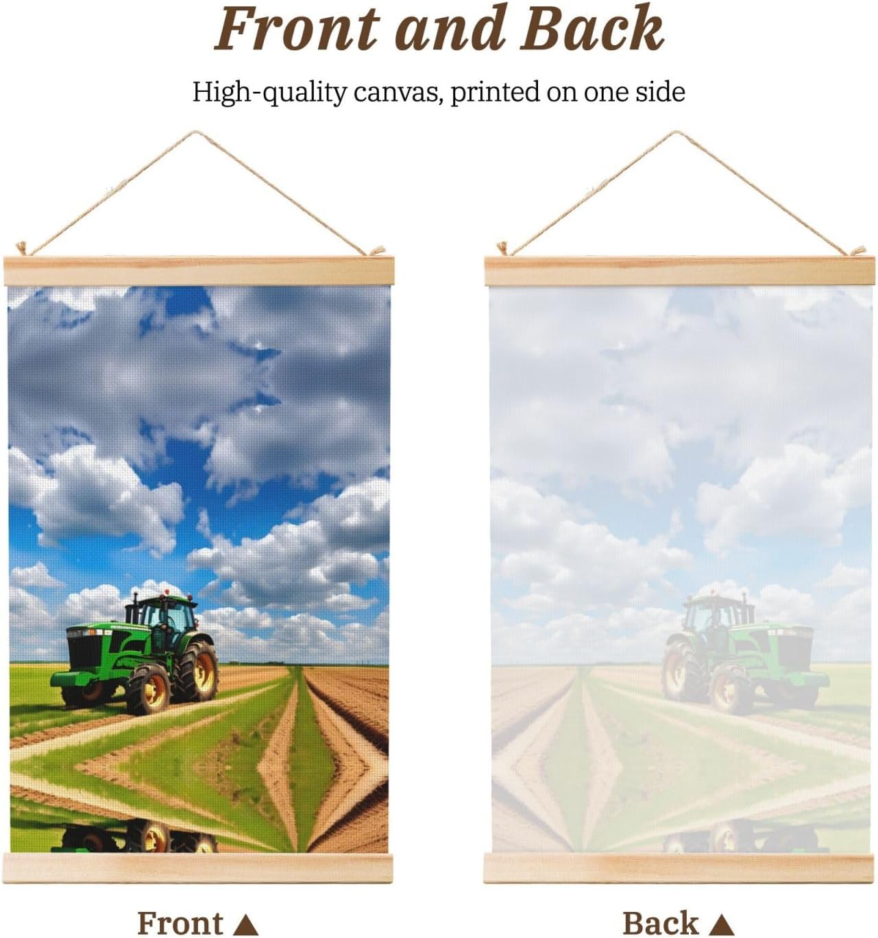 Our Tractor Under Blue Sky And White Clouds Print Wooden Poster Hanger Is An Excellent Addition To Your Home Decor Or A Perfect Gift For Friends And Family. Made Of Selected Quality Canvas With Brilliant And Enduring Colors, This Wall Art Is Designed To Resist Water, Dust, And Fading, Ensuring The Bright And Vibrant Art Lasts. The Polyester Is Enclosed Between Two Teak Wood Hanger Scrolls With An Attached 35cm Rope For Easy Hanging. Installation Is Made Simple With The Included Two Nails In A Plastic Box. The Modern Minimalist Style Of Our Wall Hanging Complements Any Home Decor, Elevating The Artistic Ambiance And Brightening Up The Room. Experience The Elegant Transformation This Wall Hanging Scroll Painting Brings To Your Spaces Today.
