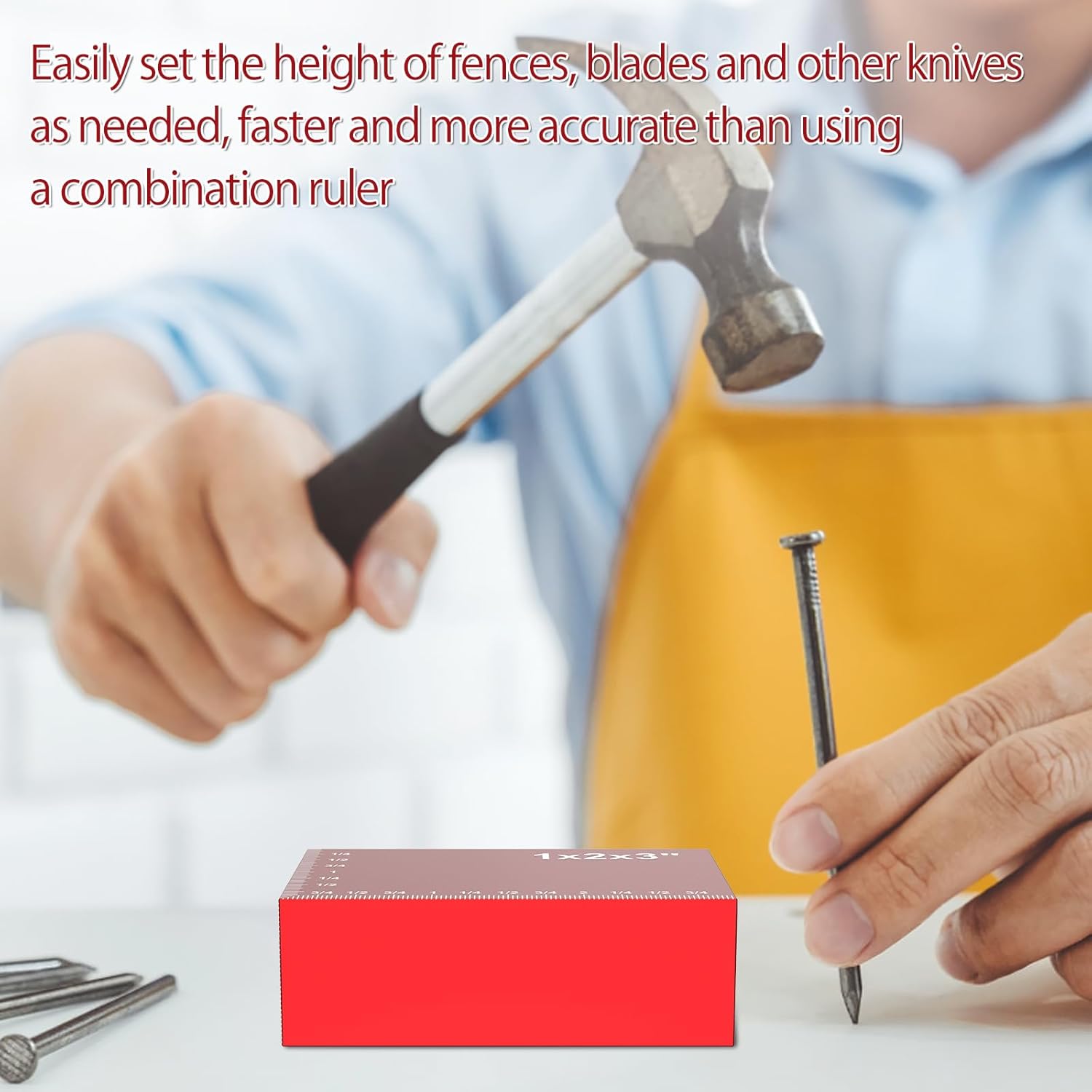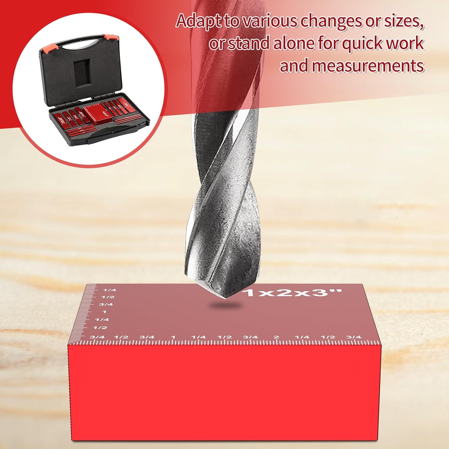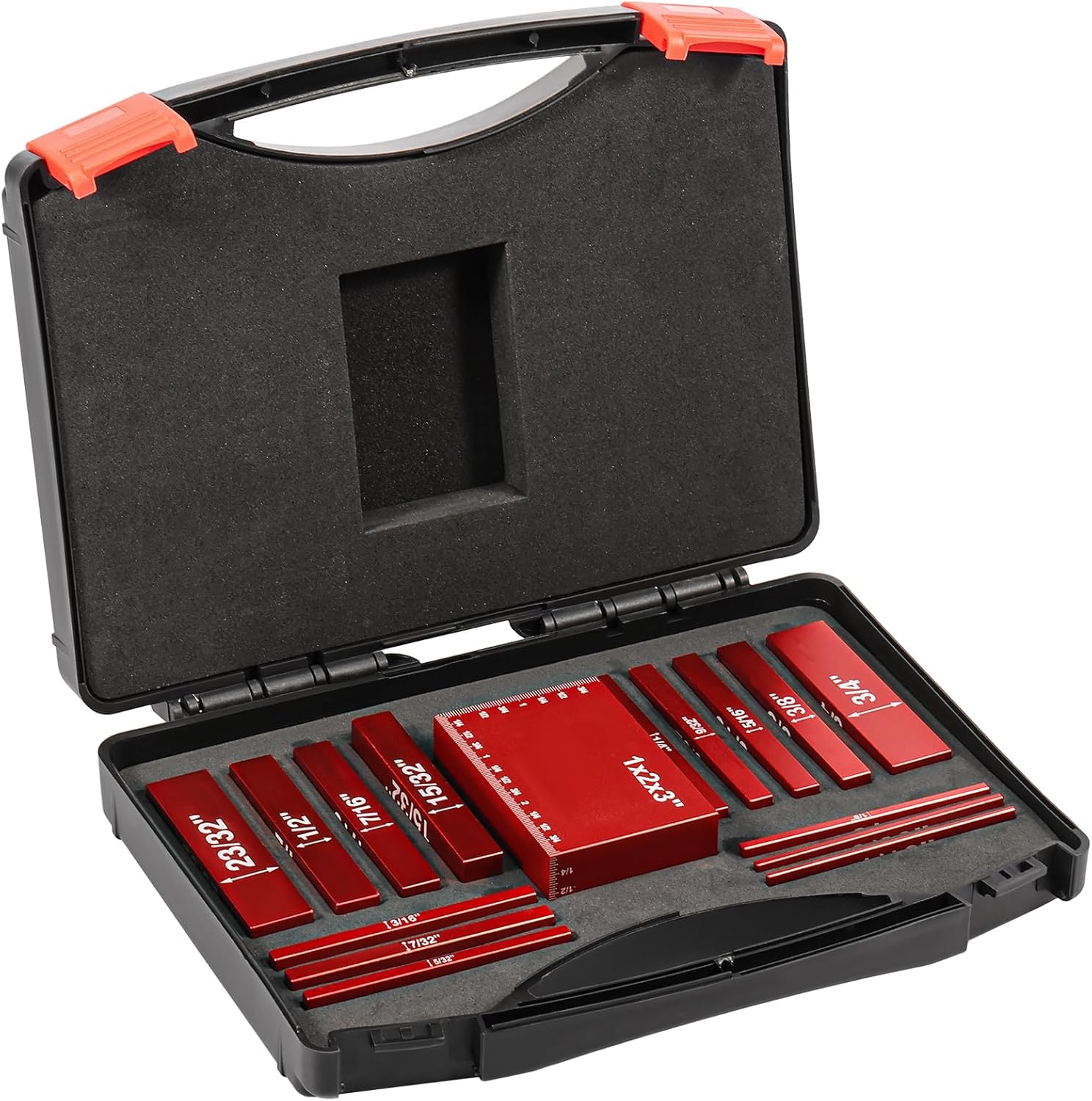 Parts List:15 x Setup BlocksProduct Specification:DescriptionThis setup block is easy to use for a variety of measurements. It features etched scale for accurate readings. Made of aluminum alloy, it can withstand frequent use. Its versatility allows different settings to be realized quickly, saving valuable time and ensuring the highest accuracy for woodworking tasks.Key FeaturesQuick Measurement: This setup blocks height gauge set works and measures accurately and quickly. It ensures reliable measurements and is suitable for carpenters.Accurate: Scale engraved for precise measurement and easy reading. The package includes 15 setup blocks of different sizes to meet different needs.SpecificationsProduct Name: Setup Blocks Height Gauge SetMaterial: Aluminum AlloyColor: RedSurface process: anodized, engraved markingsPrecision plus or minus 0.001 inches, tolerance 0.03mm.Size: 1/16, 3/32, 1/8, 5/32, 3/16, 7/32, 1/4, 5/16, 3/8, 7/16, 15/32, 1/2, 23/32, 3/4, 1x2x3 inches.Notes:1.There may be slight differences between the picture and the actual color of the commodity. We will try our best to show you the exact color.2.Please allow slight dimension difference due to manual measurement.