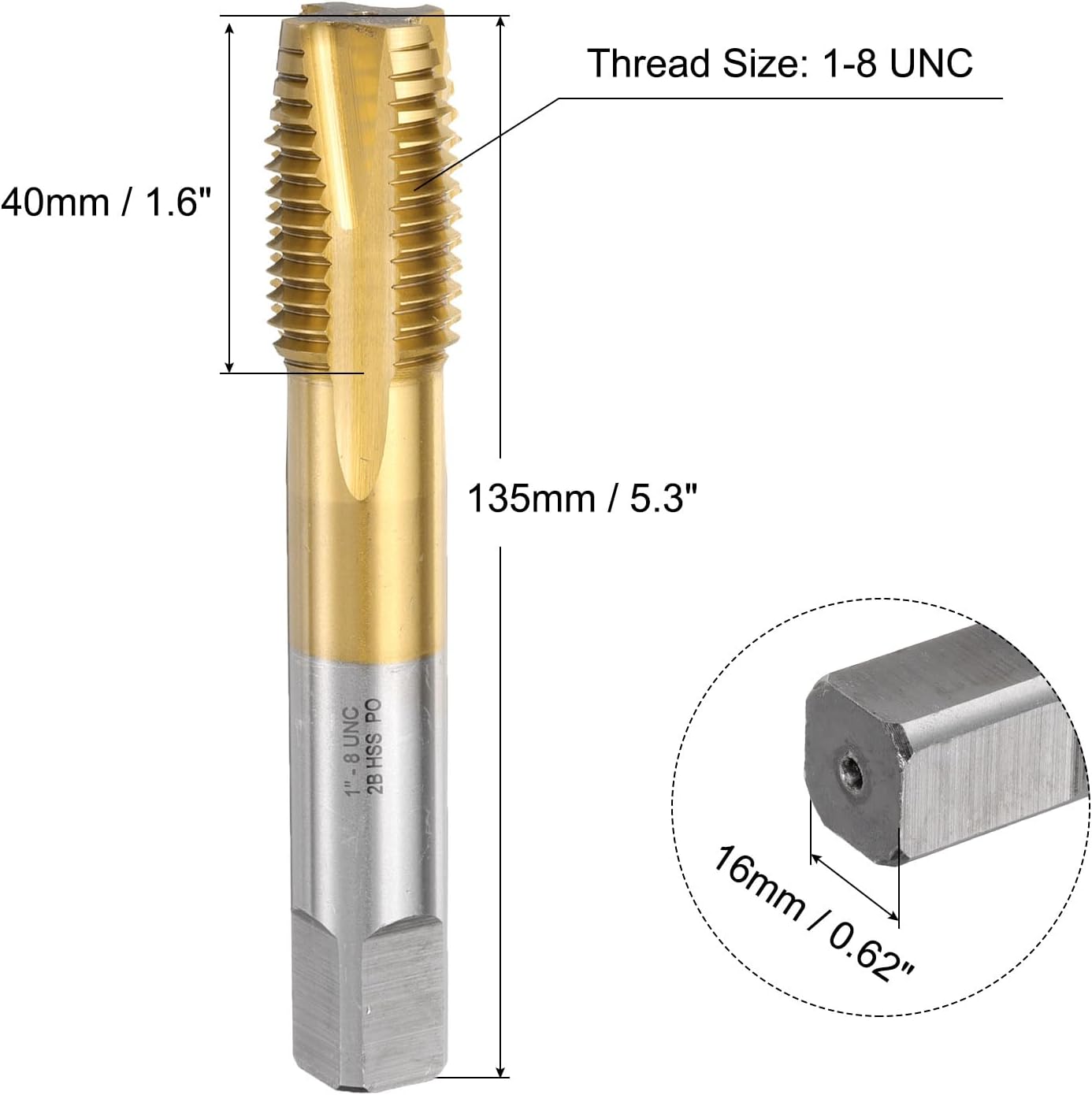 Description:Made of high-speed steel, the tapping bit has high hardness, toughness and wear resistance, and can stably remove chips during cutting. Titanium-plated threading taps can improve corrosion and oxidation resistance, extending service life, which is very suitable for a wide range of applications.Thread tapping bit features spiral point, plug chamfer and right hand thread cutting. Straight groove taps can remove chips downward, with clear threads and sharp cutting edges, ensuring fast and accurate tapping.Screw tap can be used for drilling and tapping of stainless steel, aluminum, cast iron, alloy steel, ordinary steel, non-ferrous metals, hard plastics, etc. The grooves on the tap facilitate the removal of chips and debris from the hole.Suitable for drilling machines, tapping machines, CNC machine tools and milling machines. The speed is controlled according to the hardness of the material. The higher the hardness, the slower the speed. Use with tapping oil to improve processing accuracy and reduce the probability of breakage.It is recommended to use a machine tap with a tap chuck with overload protection function. The tapping angle should be 90 degrees vertical and stable, and the tapping depth should not exceed 1.5 times the tap diameter.Specification:Thread Size: 1-8 UNCShank Side Width: 16mm / 0.63 inchThread Length: 47mm / 1.85 inchTotal Length: 135mm / 5.3 inchAccuracy: B2Material: HSS 6542 (High Speed Steel 6542)Finish: Titanium CoatedPackage Content:1pcs x Spiral Point Thread Tap