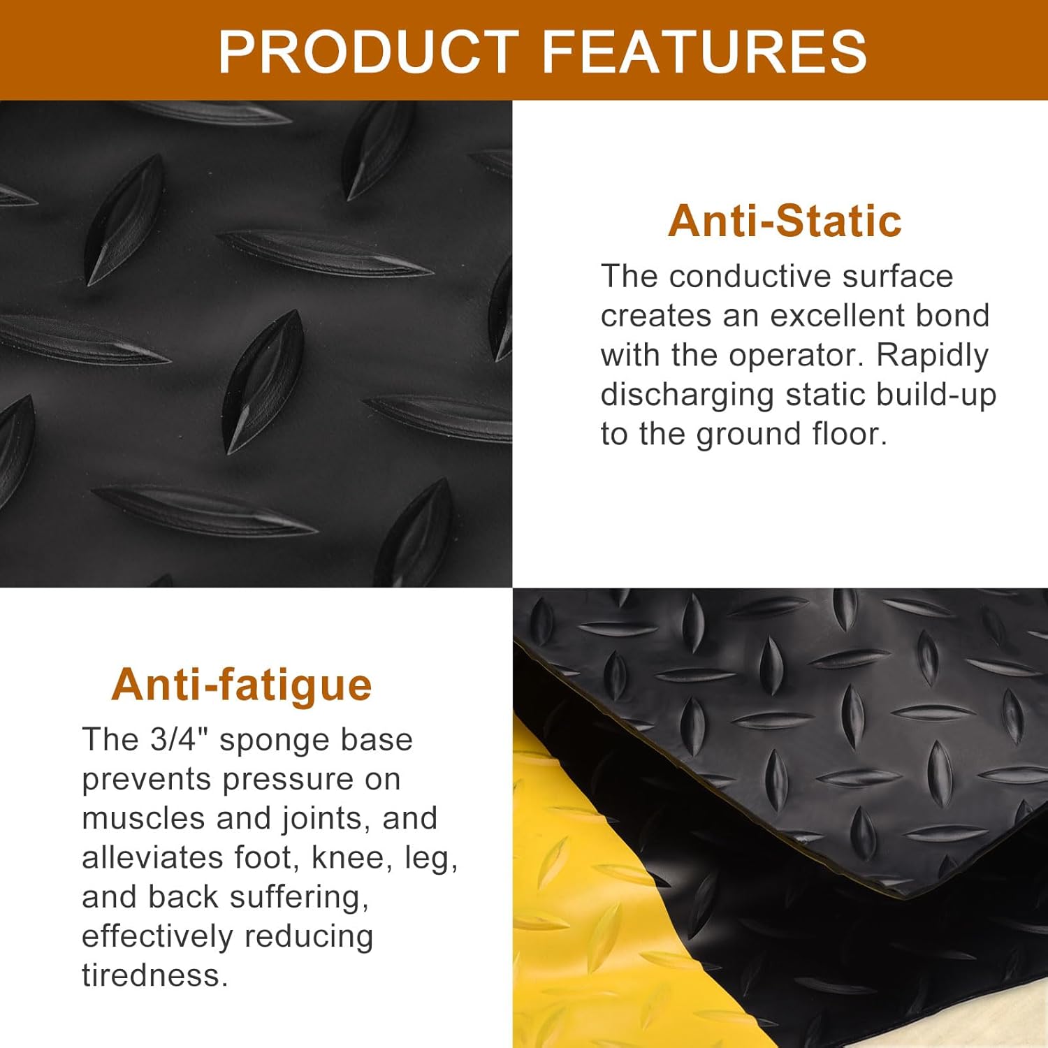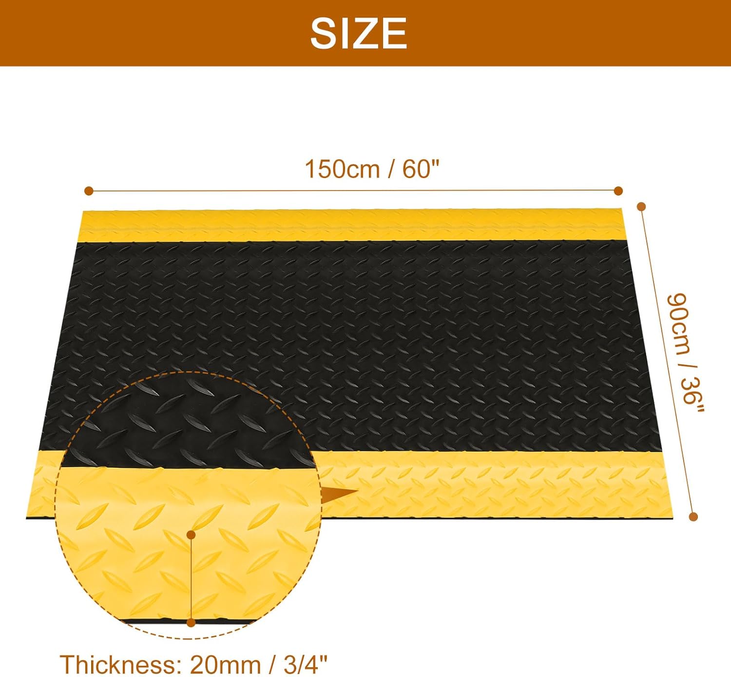Advantage Made of soft PVC foam which provides a thick cushion to provide support and comfort when standing.The non-slip base keeps the mat in place and prevents slippage. The bevel/tapered edge reduces the risk of tripping on the mat.Prevent pressure on muscles and joints, and alleviates foot, knee, leg, and back suffering, effectively reducing tired.Widely used in warehouses, picking lines, assembly lines, work stations, check-out stations, and labsSpecification:- Material: PVC- Top Surface: Ribbed Pattern- Color: Black- Size: 150 cm x 90 cm/5' L x 3' W- Thickness: 20 mm/3/4 inch- Package Included: 1 pcs x floor mat