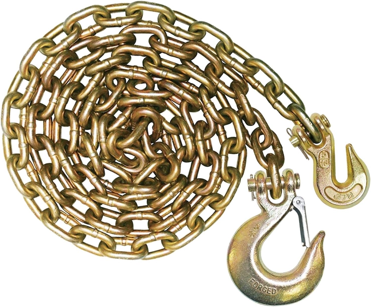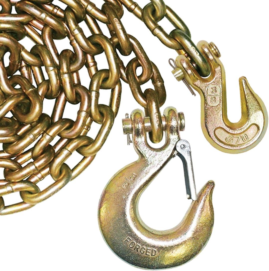 Hooks Include Safety Latches For Secure Attachment Certified G70 transport chain End #1: G70 forged clevis grab hook End #2: G70 forged clevis sling hook Sling hook includes safety latch Perfect for heavier vehicles and machinery Safe Working Load of 6,600 lbs. Meets or exceeds all DOT regulations Not intended for overhead lifting