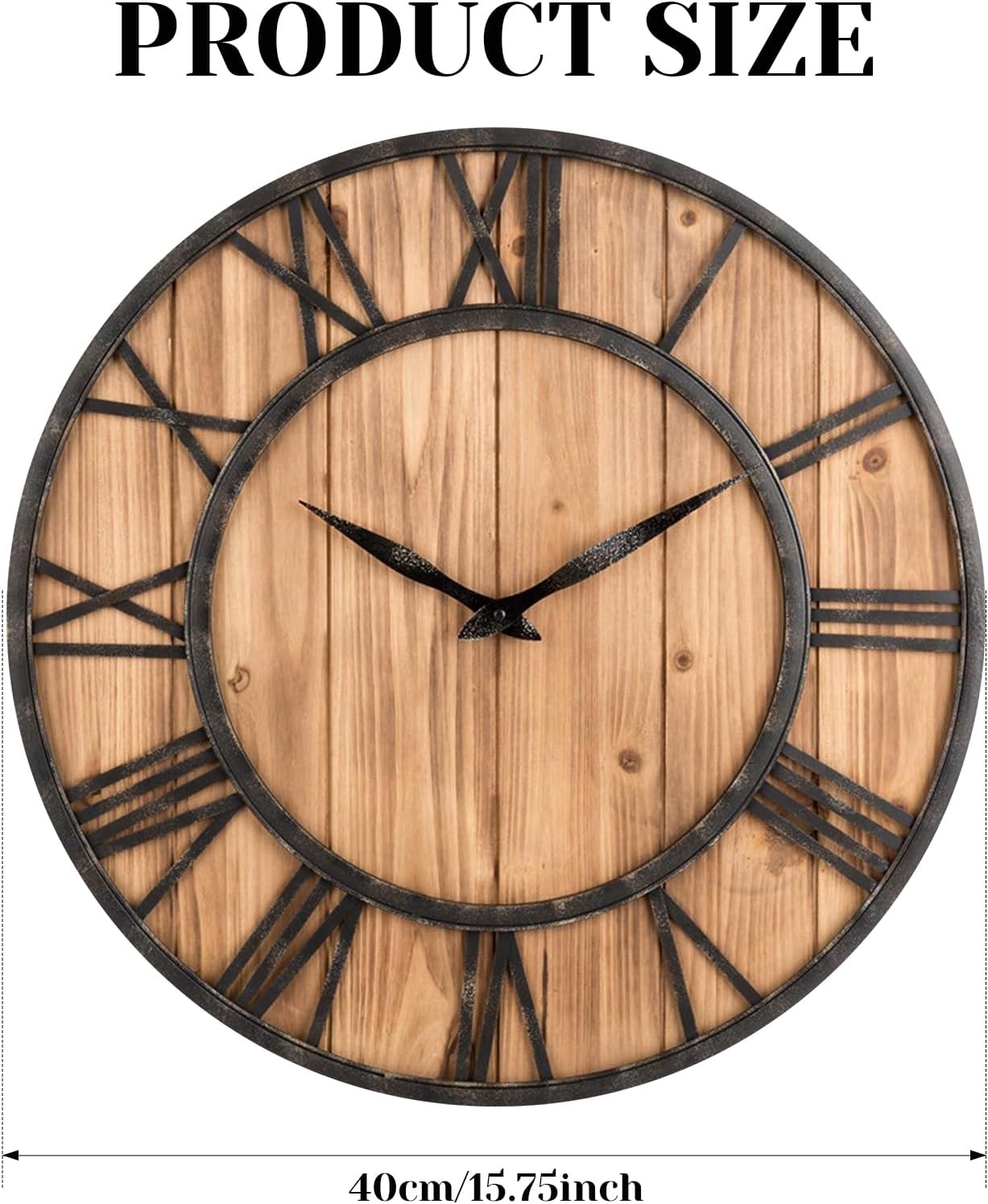 Description: Elevate your home décor with the 16-inch Wall Clock featuring black iron Roman numerals. This battery-operated wall clock combines a classic vintage design with modern functionality, ensuring silent operation for peaceful spaces like bedrooms and living rooms. Made from wood and sturdy materials, it's built to last while adding elegance to any room. Easy to install and use with simple instructions and a lightweight design, it's perfect for enhancing your home's aesthetic. Whether in the living room or bedroom, this versatile wall clock brings timeless charm to your space. Features:. Wall Clock. -Color: Wood Color and Black. -Material: Iron. -Size: about 40cm/15.75inch. Note:Manual measurement, please allow slight errors on size.The colors may exist slight difference due to different screens. Package Including 1 x Wall Clock.