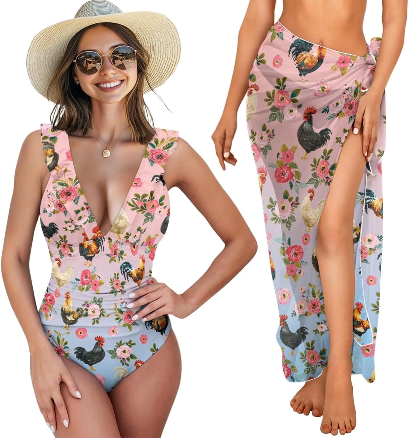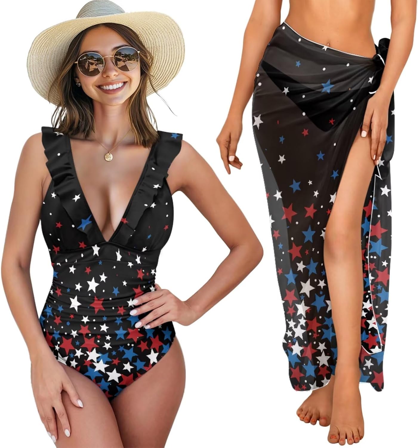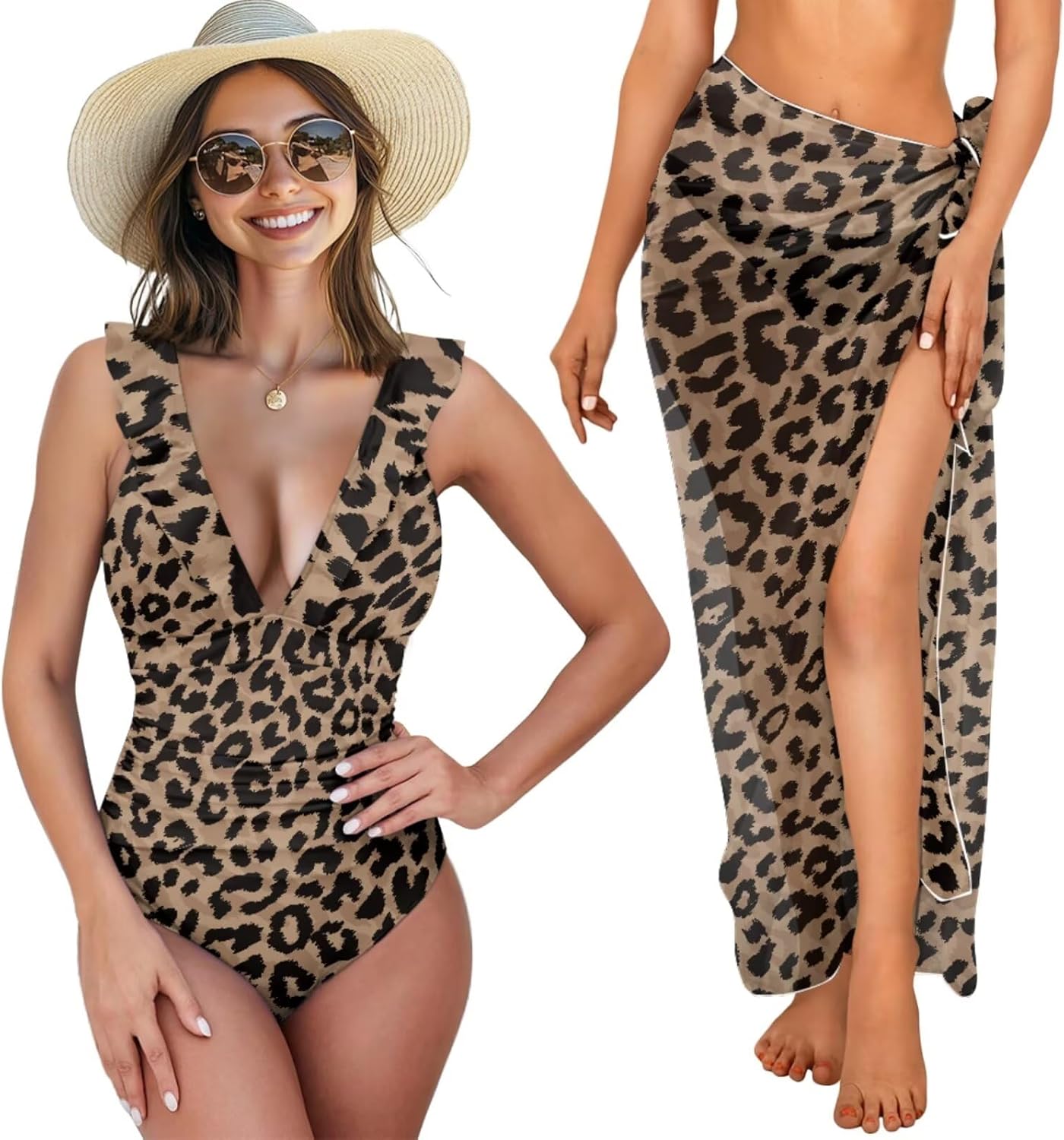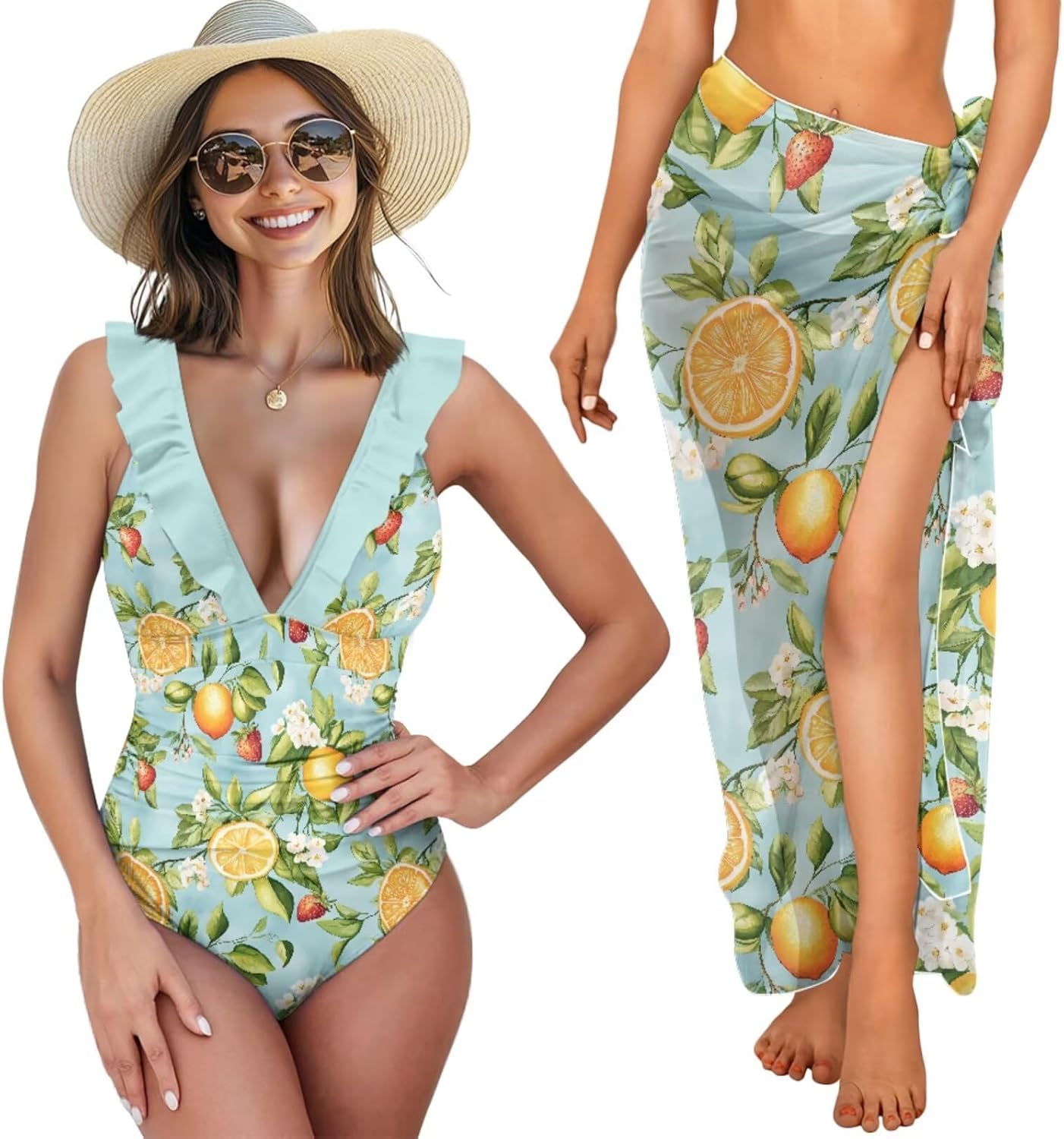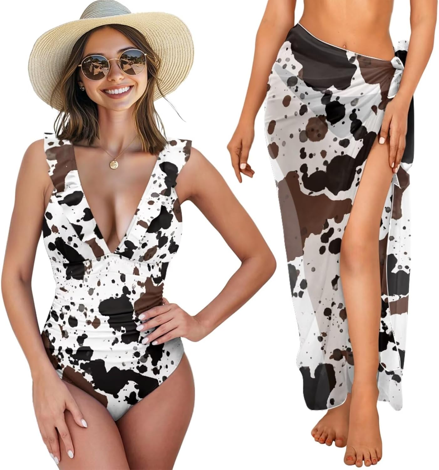 Women's Ruffled One Piece Swimsuit with Sarong Cover Up Set Fashion Design This beach set comprises a ruffled one-piece swimsuit and a sarong cover-up, versatile for various occasions. Style the sarong as a skirt, chest wrap, or shawl, effortlessly matching any swimwear. This swimwear features a lace-up back, V-neck, and elegant ruffles. Comfortable soft cups provide enough support, making you look sexy. Material and Size This cover up beach set is made from a soft, stretchy polyester-spandex blend, providing durability, elasticity, and quick-drying properties. The fabric ensures a flattering, comfortable fit with lasting shape. The swimsuit is available in six sizes (XS to 2XL), fitting a range of body types. The sarong cover-up is one-size-fits-all. For the best fit, please refer to our Size Chart before ordering. Versatility and Occasions This one-piece swimsuit with cover-up set is perfect for pool parties, vacations, honeymoons in Hawaii, cruises, and water parks. It also fits well with water sports, beach volleyball, and other activities. The stylish bathing suit set is an ideal gift for a wife, girlfriend, sister, mom, and friends on any special day or in daily life.