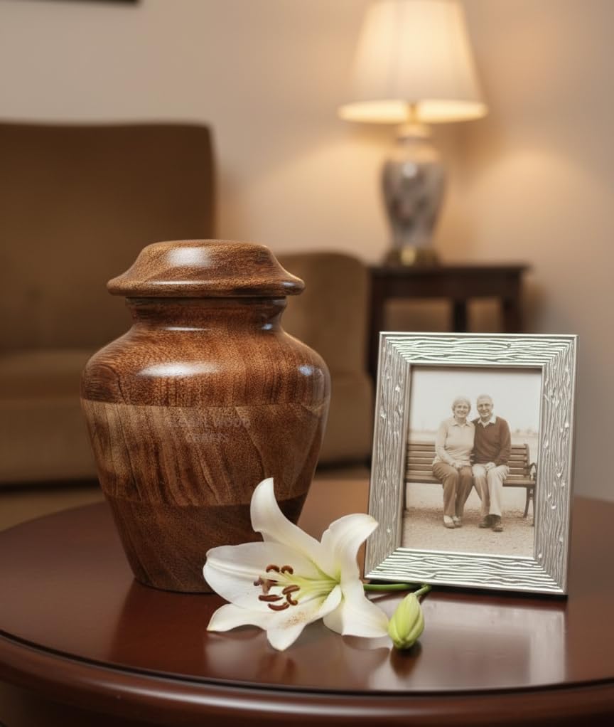 Honor your loved ones with this exquisite handcrafted mango wood keepsake urn. Each piece showcases the natural beauty of mango wood, with its distinctive grain patterns and warm, rich tones creating a unique memorial. The rounded silhouette features elegant proportions and a carefully fitted lid, offering a dignified vessel for preserving precious memories. This small-sized urn combines traditional craftsmanship with timeless design, making it suitable for both display and safekeeping. The smooth, polished finish highlights the wood's natural characteristics while providing durability. Perfect as a memorial keepsake, this urn represents both respect and remembrance with its thoughtful design and quality construction. The versatile style complements any home decor, creating a tasteful tribute that can be cherished for generations.