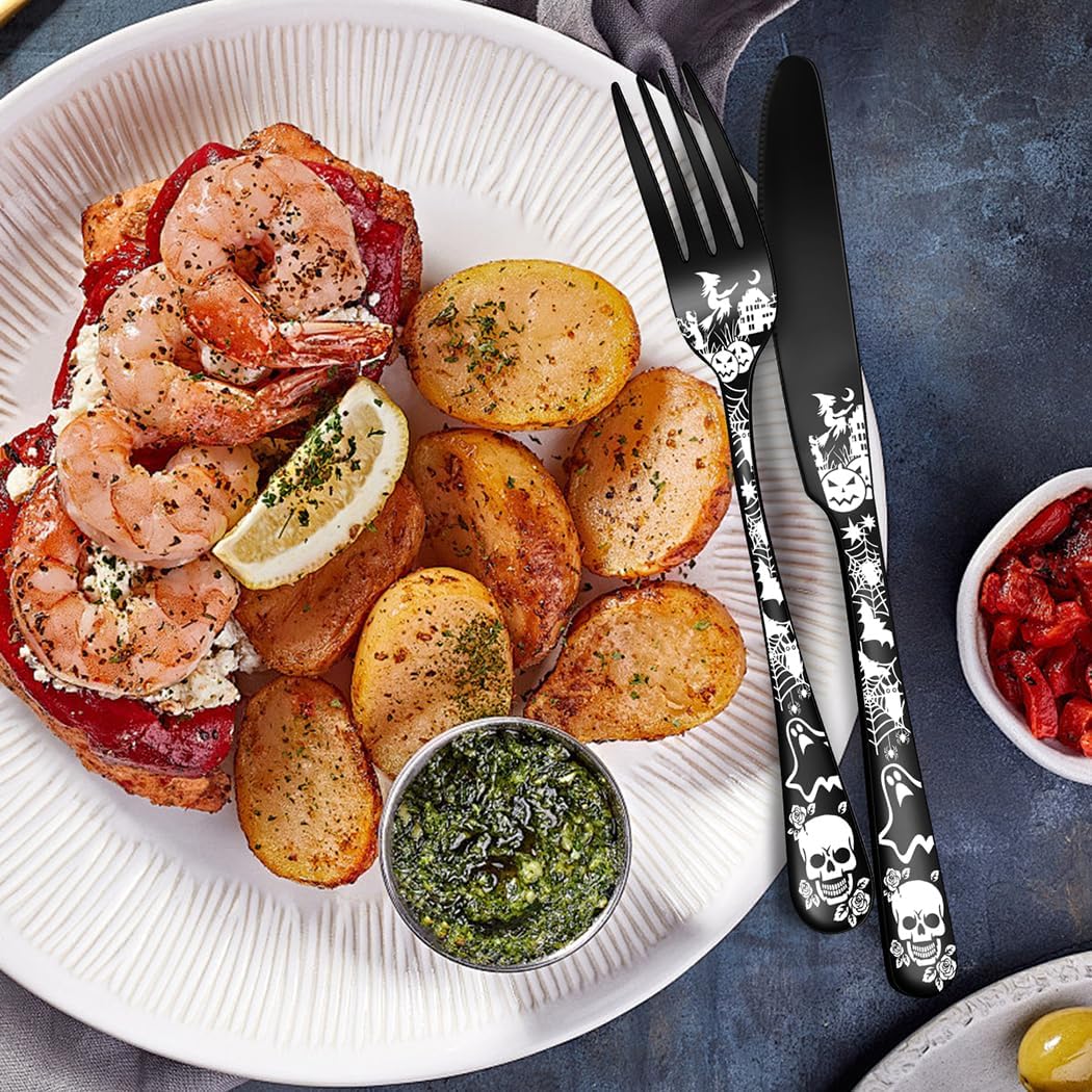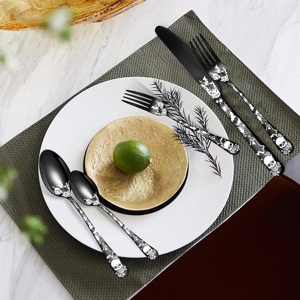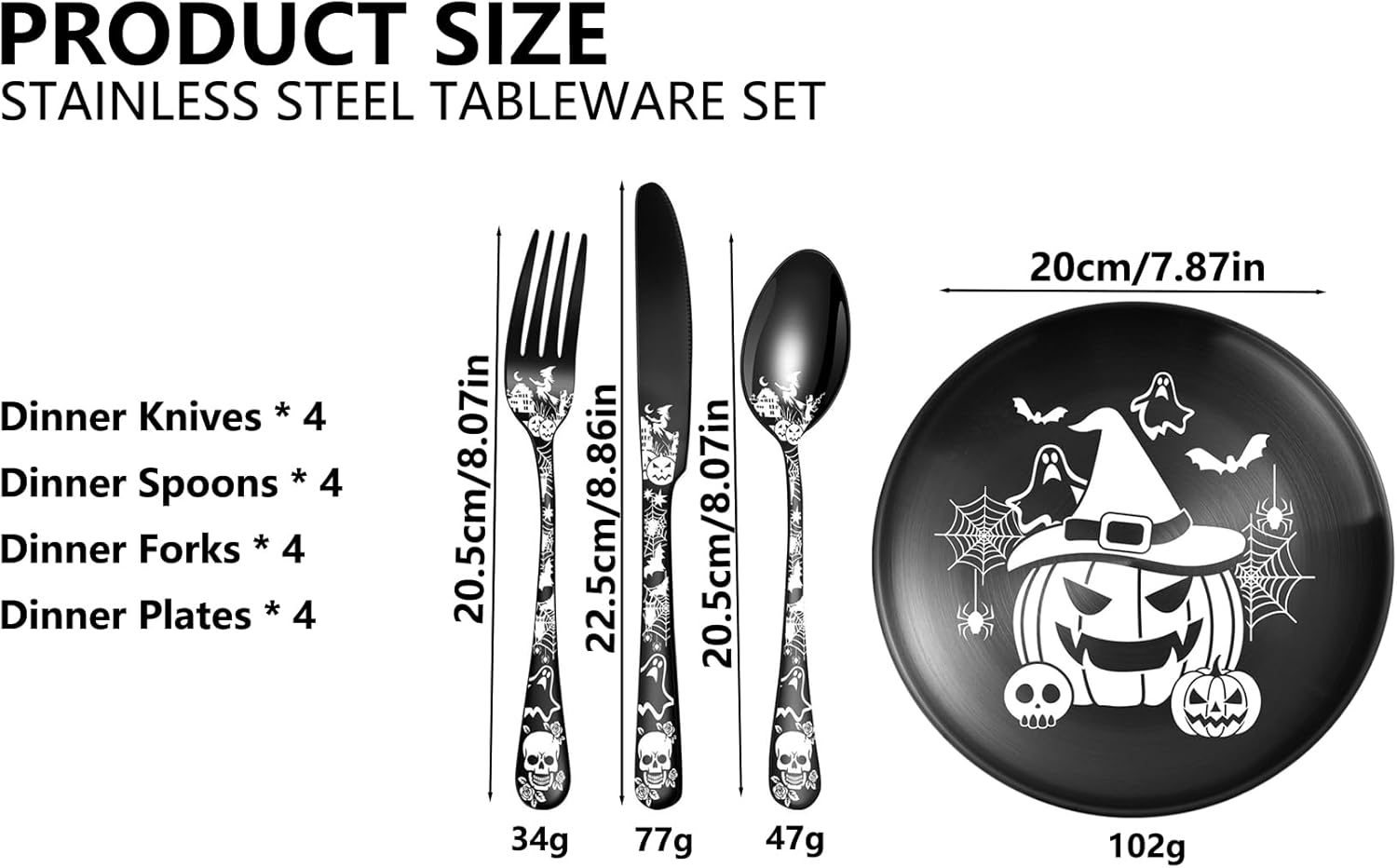 Are you looking for a durable and fancy Halloween cutlery set? You'll find it in here. The skeleton cutlery set is a collection of metal utensils that draw inspiration from Halloween themed. The set includes a dinner plates, dinner forks, dinner knives, and dinner spoons, perfect for use at Halloween parties or other themed events. With gothic skull , flower and bat pattern handles, these utensils exude a lifelike quality and add a unique decorative element to the dining table. This skull cutlery set adds a touch of macabre and whimsy to Halloween parties or themed events. Dinner Plate 8.07" length. The 8.07 inch Halloween dinner plates provide ample space for main dishes, and it can also be used as a salad plate, ideal for serving delectable treats. Dinner Fork 7.99" length. The size of the fork is perfect for everyday dining, and the front tines make it easy to pick up different foods without cutting your mouth. Dinner Knife 8.86" length. The ergonomic handle has a proper thickness without sharp edges, very comfortable to use and cut, and the blade has the right sharpness for both adults and children. Dinner Spoon 7.99" length. Larger spoons are versatile in use even on their own, professional spoon bowl and handle design, very smooth surface, no sharp edges or rough points, will never hurt your mouth when used. Package Include: 4 x dinner plates 4 x dinner forks 4 x dinner knives 4 x dinner spoons